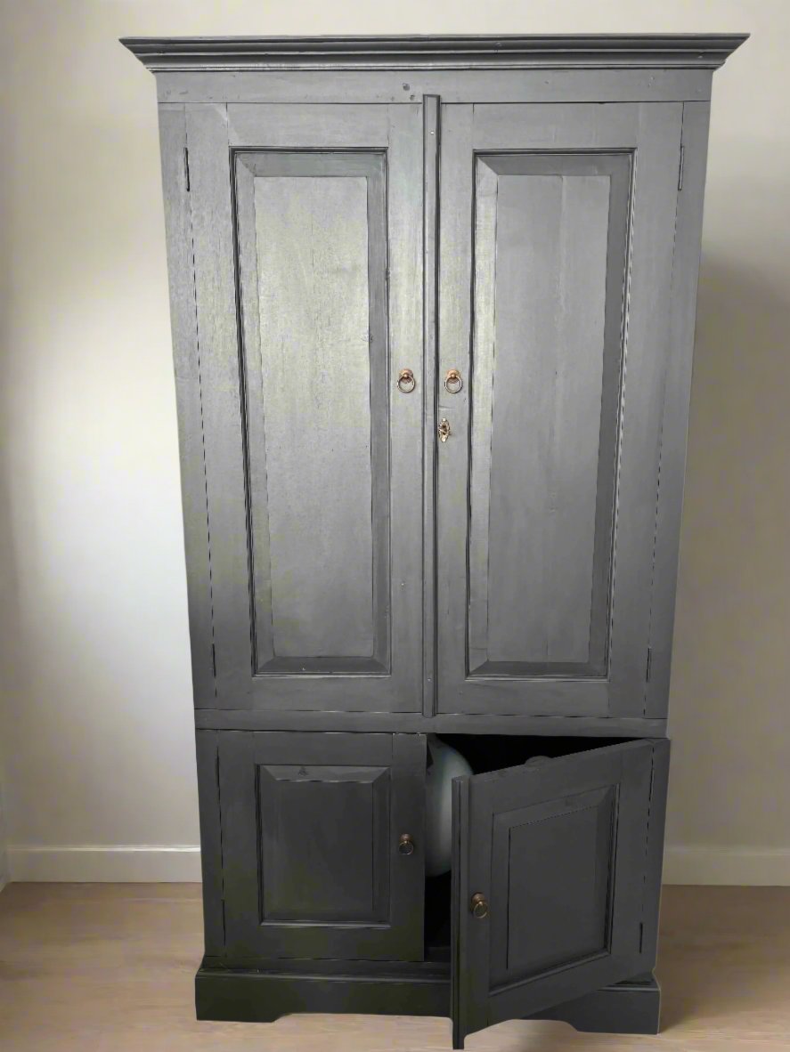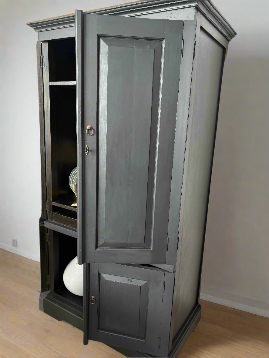 Реновиран в модерен черен опушен цвят, той съчетава винтидж чар с актуален дизайн, което го прави идеален за съвременни интериори. Двойните панти осигуряват удобство при използване, а здравата конструкция гарантира дългогодишна употреба.