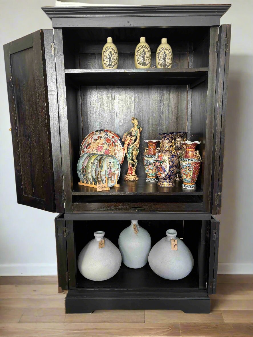 Добавете изисканост и функционалност към вашия дом с този винтидж колониален шкаф, изработен от изцяло масивно дърво. Със своите две големи и две малки врати, рафтове и изтеглящ се плот, шкафът предлага разнообразни приложения – от кухня и трапезария до спалня или като ТВ шкаф.