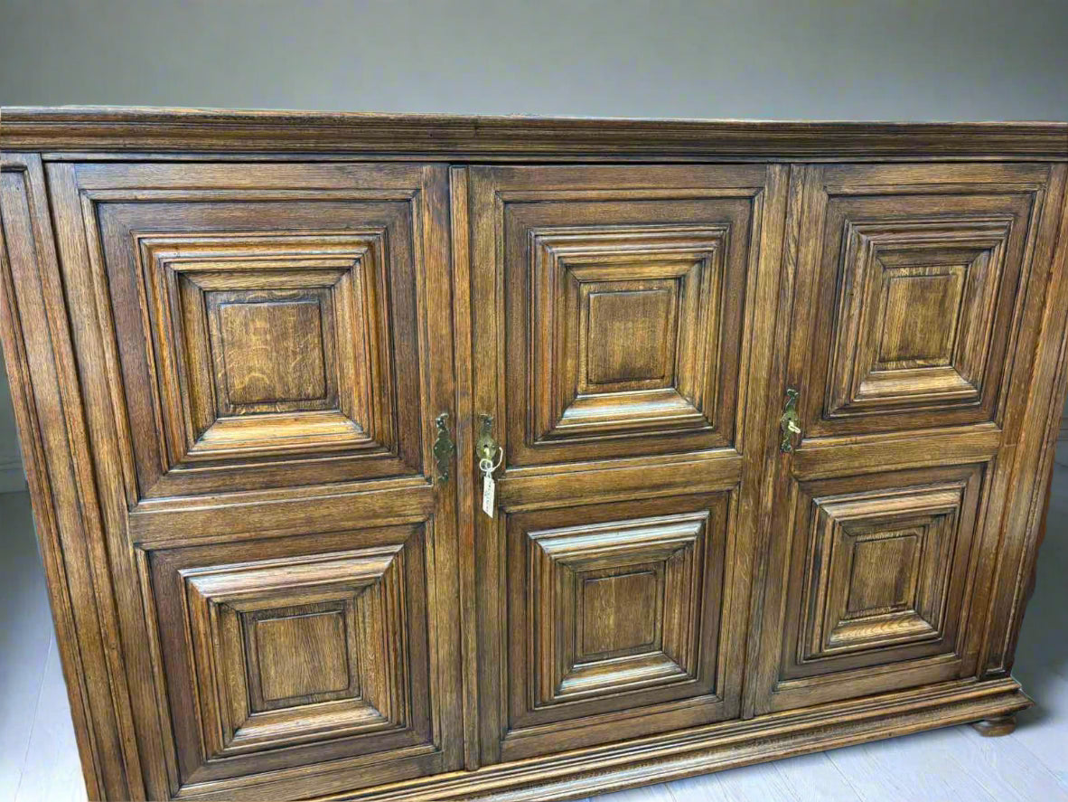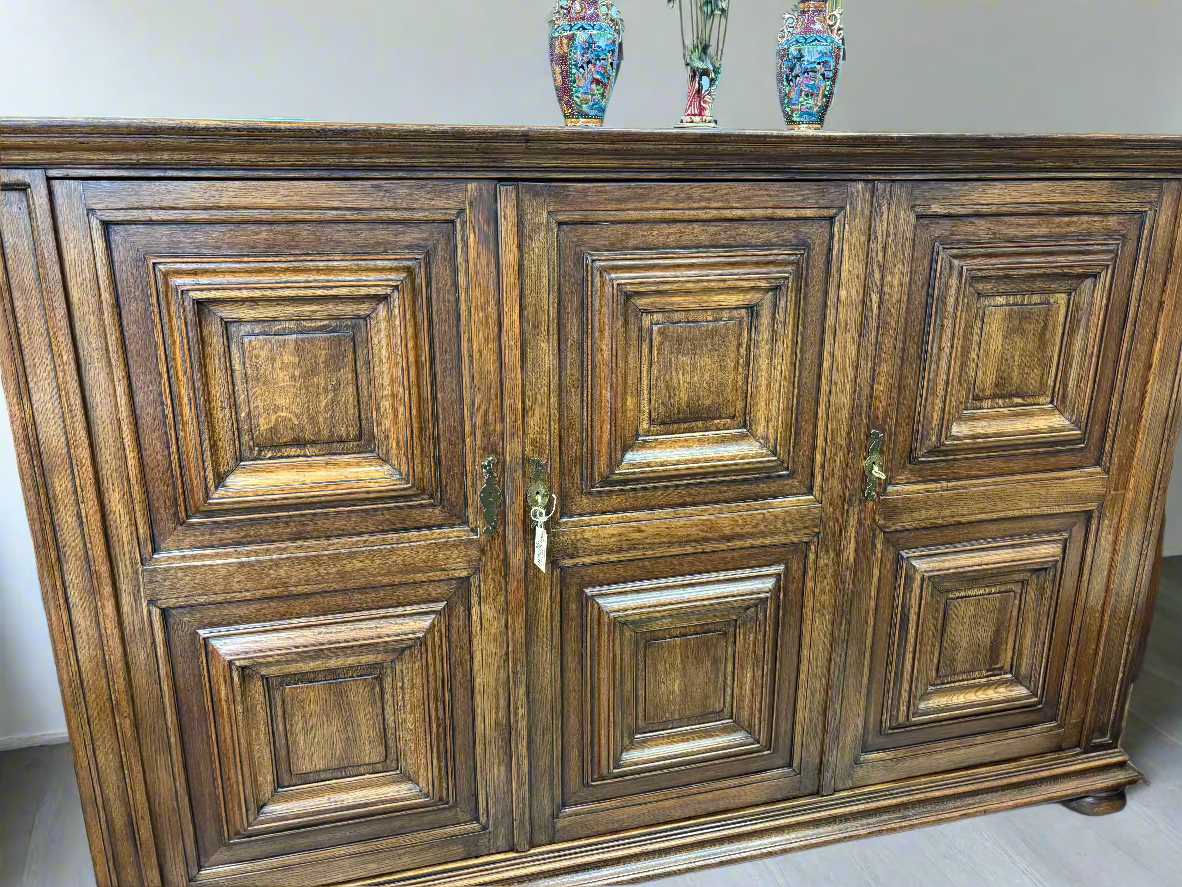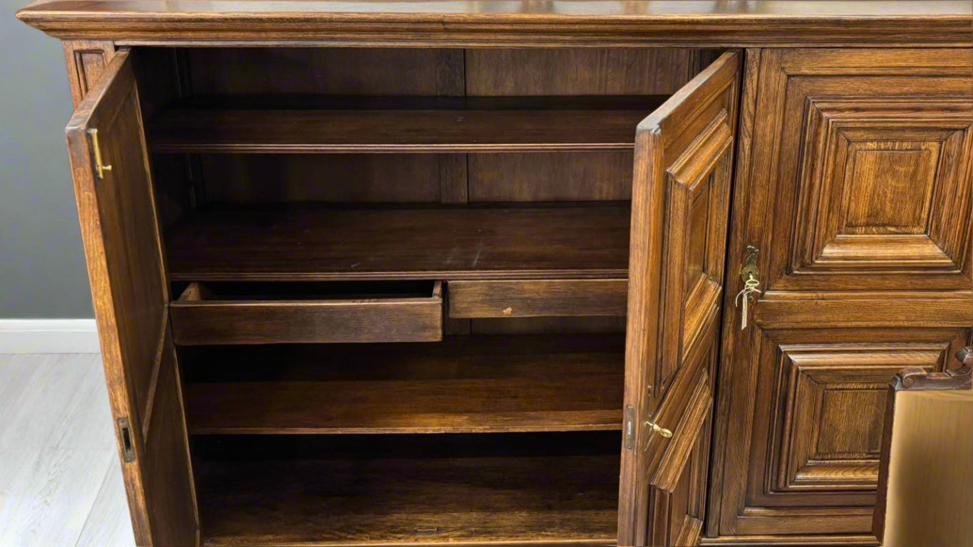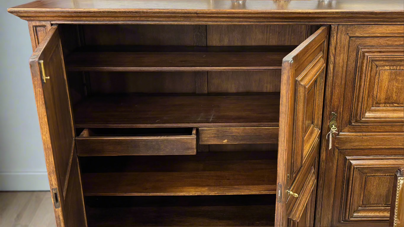 Впечатляващ шкаф с три врати, изпълнен в стил Ренесанс/Неоренесанс. Масивна изработка от дъб, с класически профилирани панели и оригинални елементи : месингови ключалки и механизми. Произведен през втората половина на XIX – началото на XX век в духа на т.н."историзъм"(Historicist style). В отлично състояние. Широко приложение в дома, може да бъде използван за бюфет, скрин или шкаф за съдове/ спално бельо.