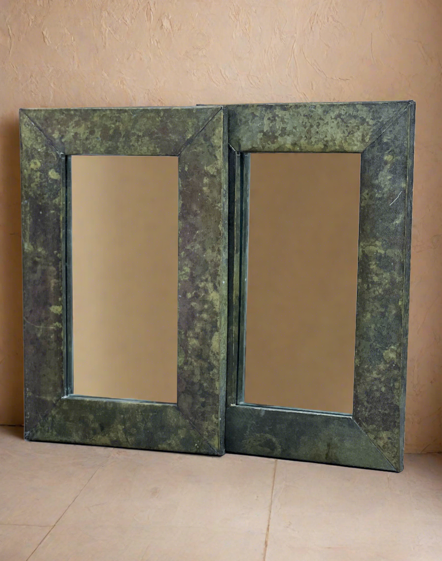 Two decorative, rectangular mirrors. The mirrors are framed in metal frames with an interesting rusty effect. The products are great for furnishing a modern home adding industrial style and design.