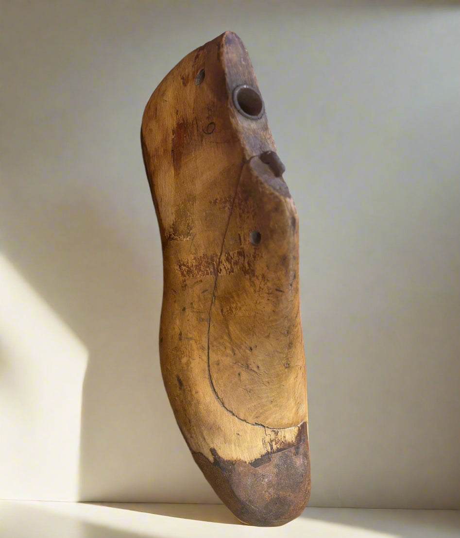 Автентичен дървен калъп за обувки, използван в професионална обущарска работилница или във фабрика за обувки през първата половина на 20-ти век.