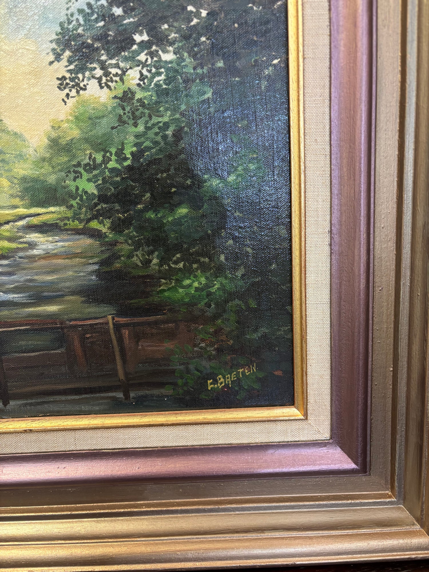 Painting with forest landscape and mill, Belgium. Painted with oil paints in original version. The picture is framed in a dark wood frame.