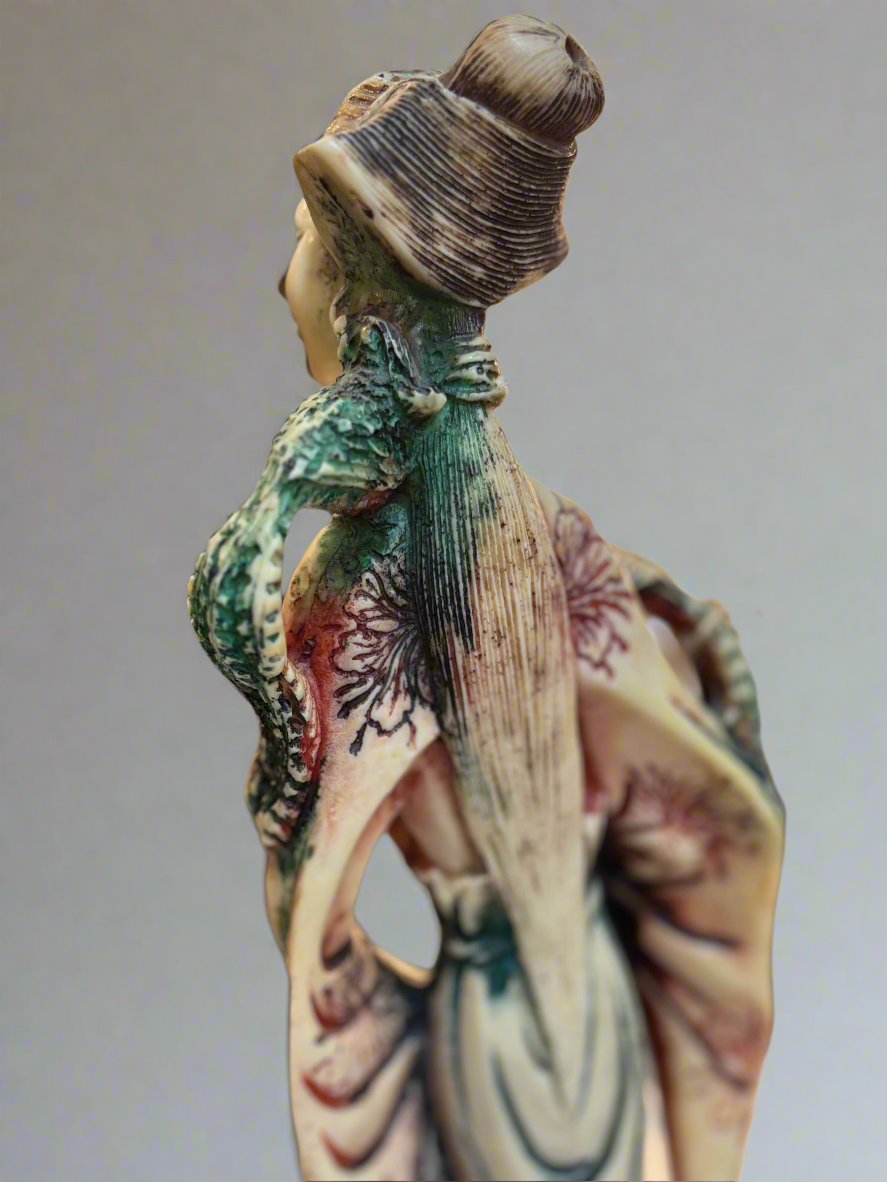 С размери 49 см, тази величествена статуя пленява окото със своите прецизни детайли и внушително присъствие, доказателство за таланта и отдадеността на майстора. Всяка извивка и изражение на тази статуя разкрива история, богата на традиции и символика, което прави това произведение истинско произведение на изкуството, което вдъхва страхопочитание и съзерцание.