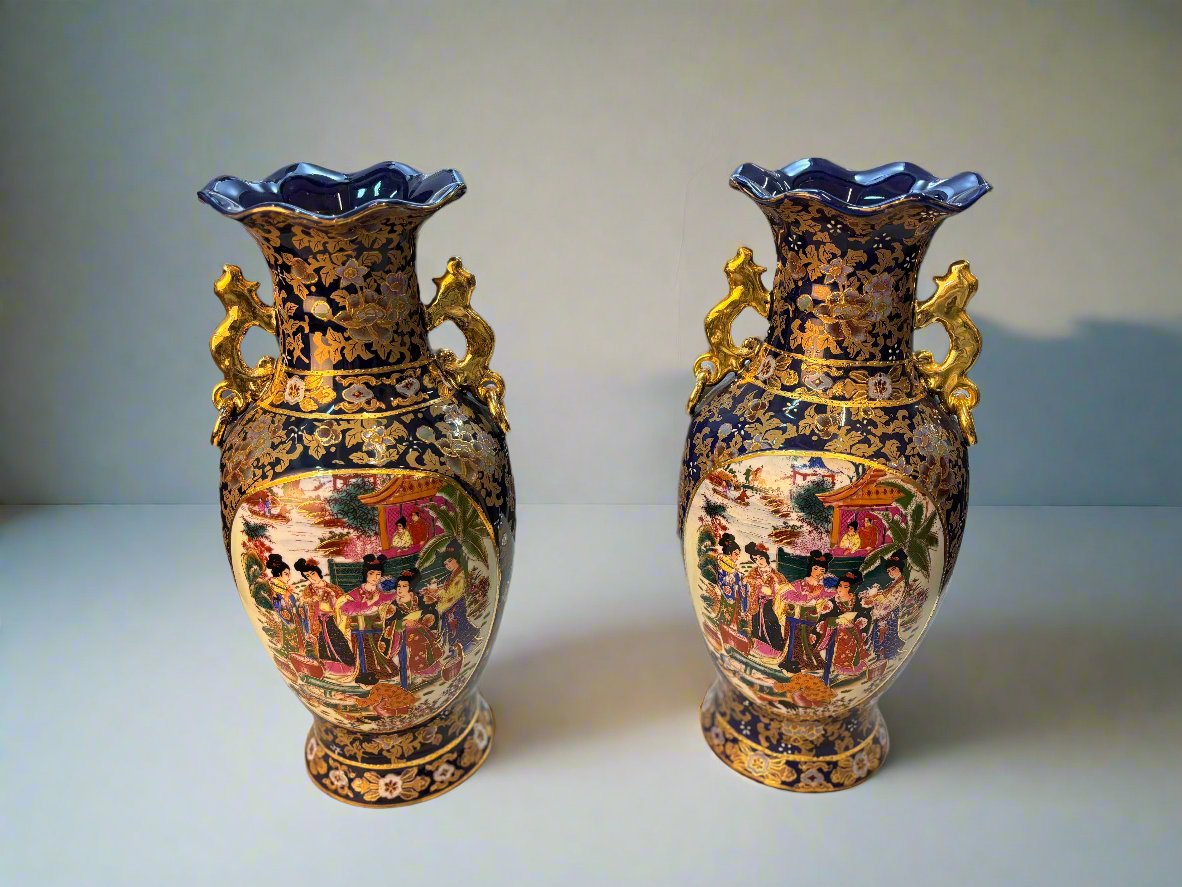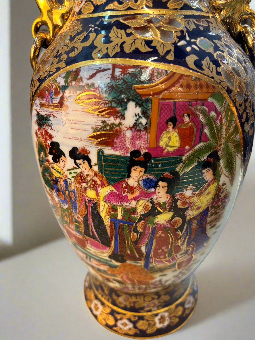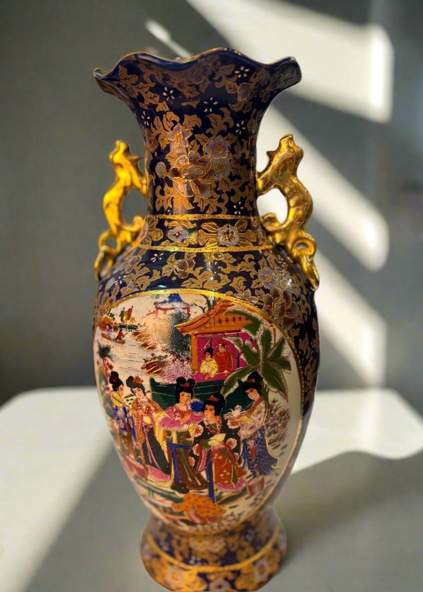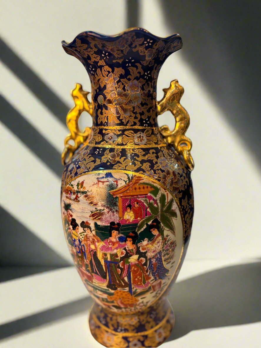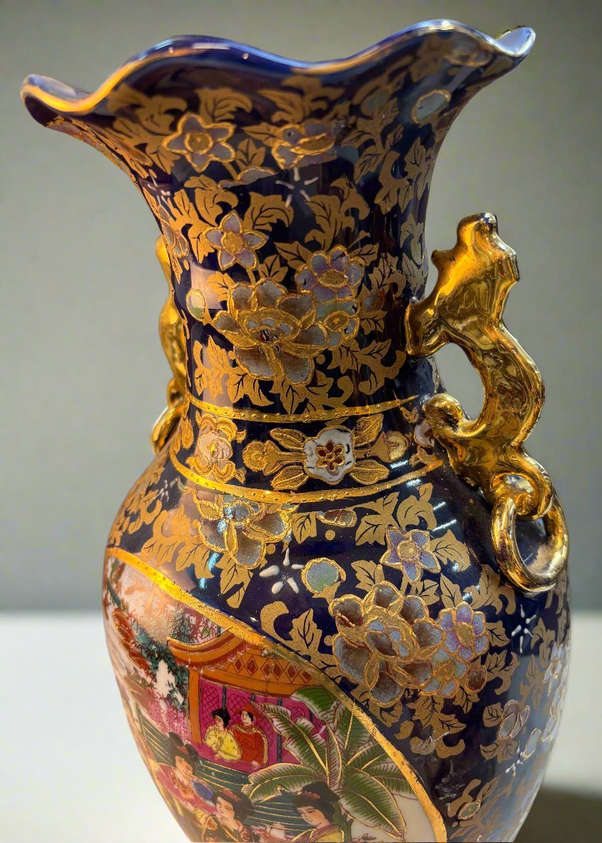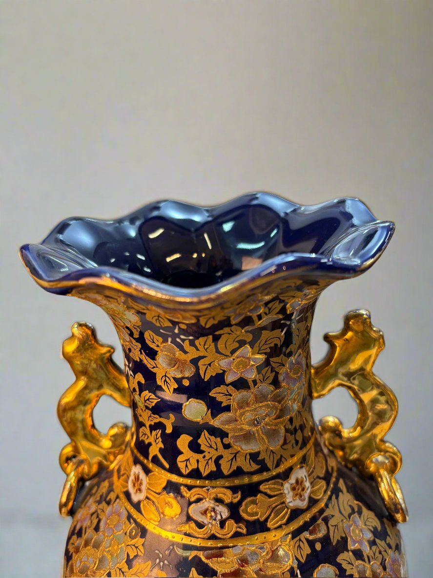 Кобалтово синя ваза от китайски порцелан, с изящни златни детайли Zhong Guo Zhi Zao. Произведена в Китай 1970-1979, с маркировка.
