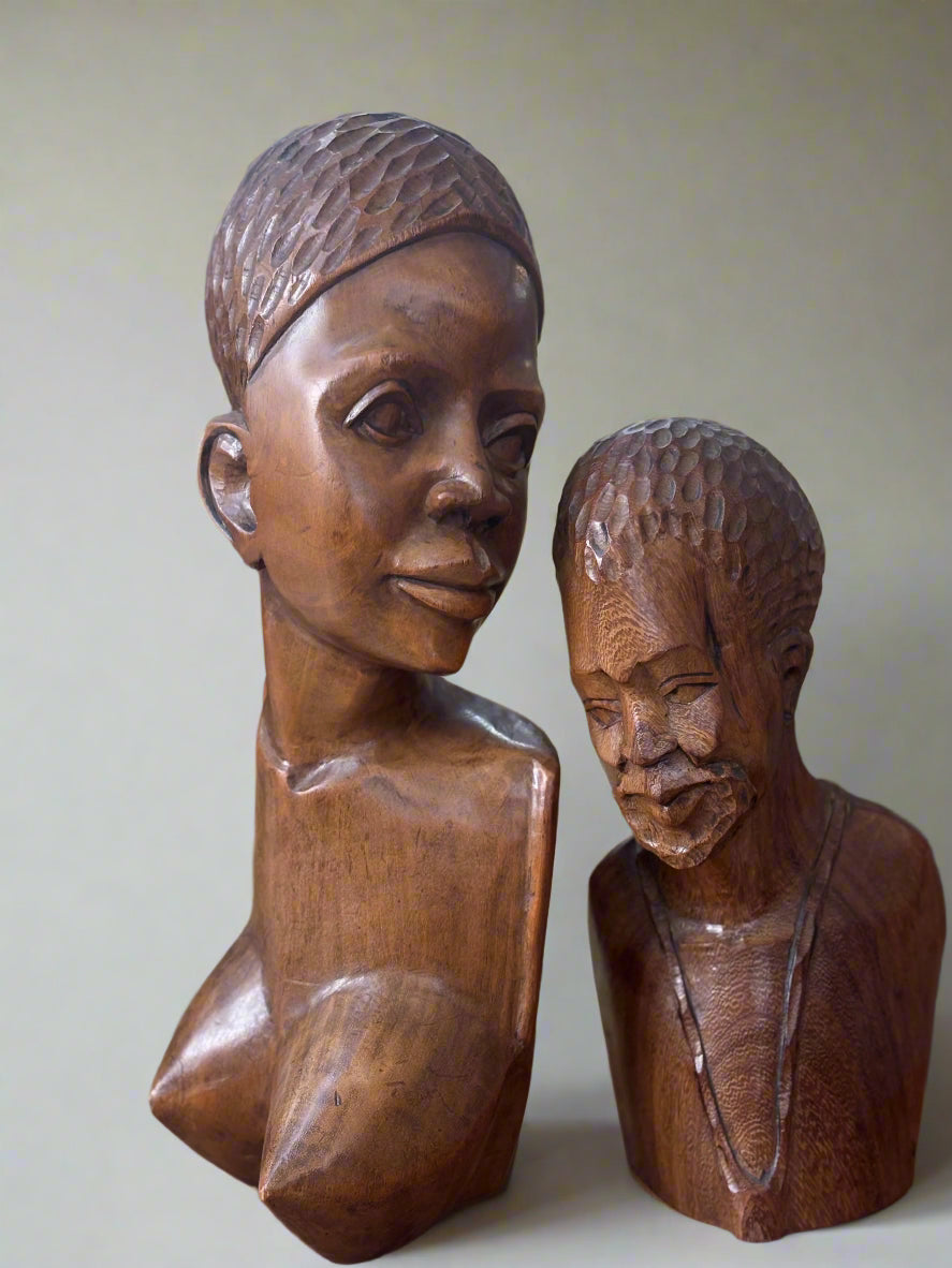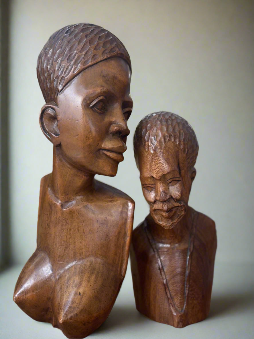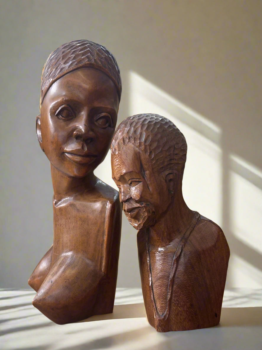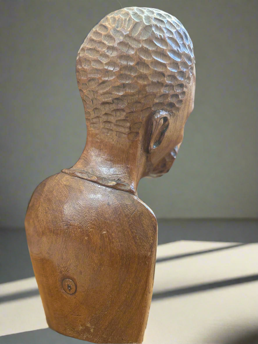 Емоционален и детайлно изработен ръчен дърворезбован бюст, представящ мъжка фигура с характерно излъчване и изразителни черти. Този артистичен обект носи в себе си дълбочината на африканската култура и уважение към занаятчийското майсторство.