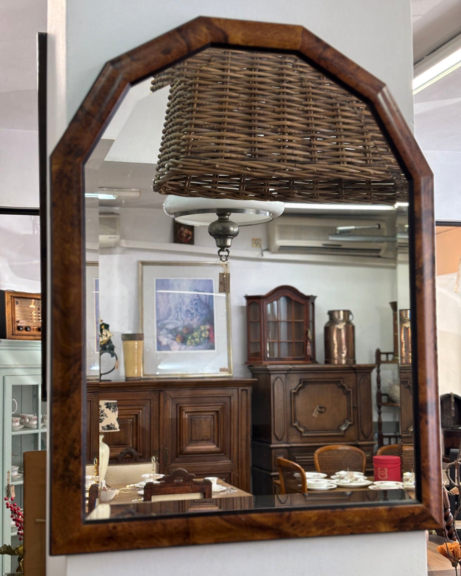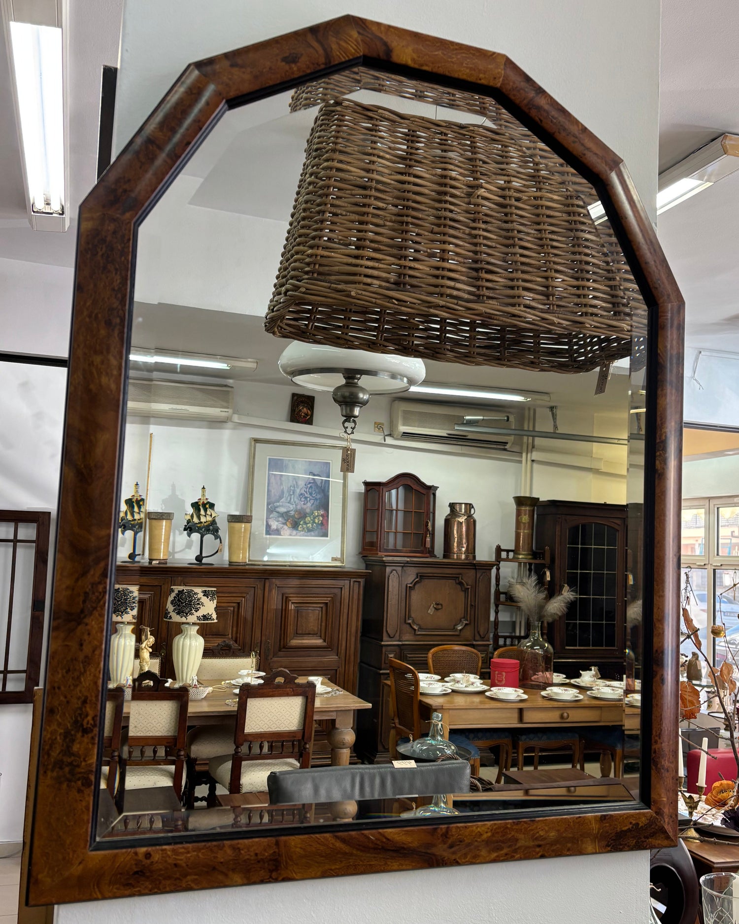 Красиво винтидж огледало от 60-те години , с махагонова рамка и кристално стъкло. Красивият класически цвят, изчистената визия и средните размери, правят това осмоъгълно огледало, подходящо за всеки интериор и помещение. Това бужу, би донесло полъх на стил и класа във всеки дом.