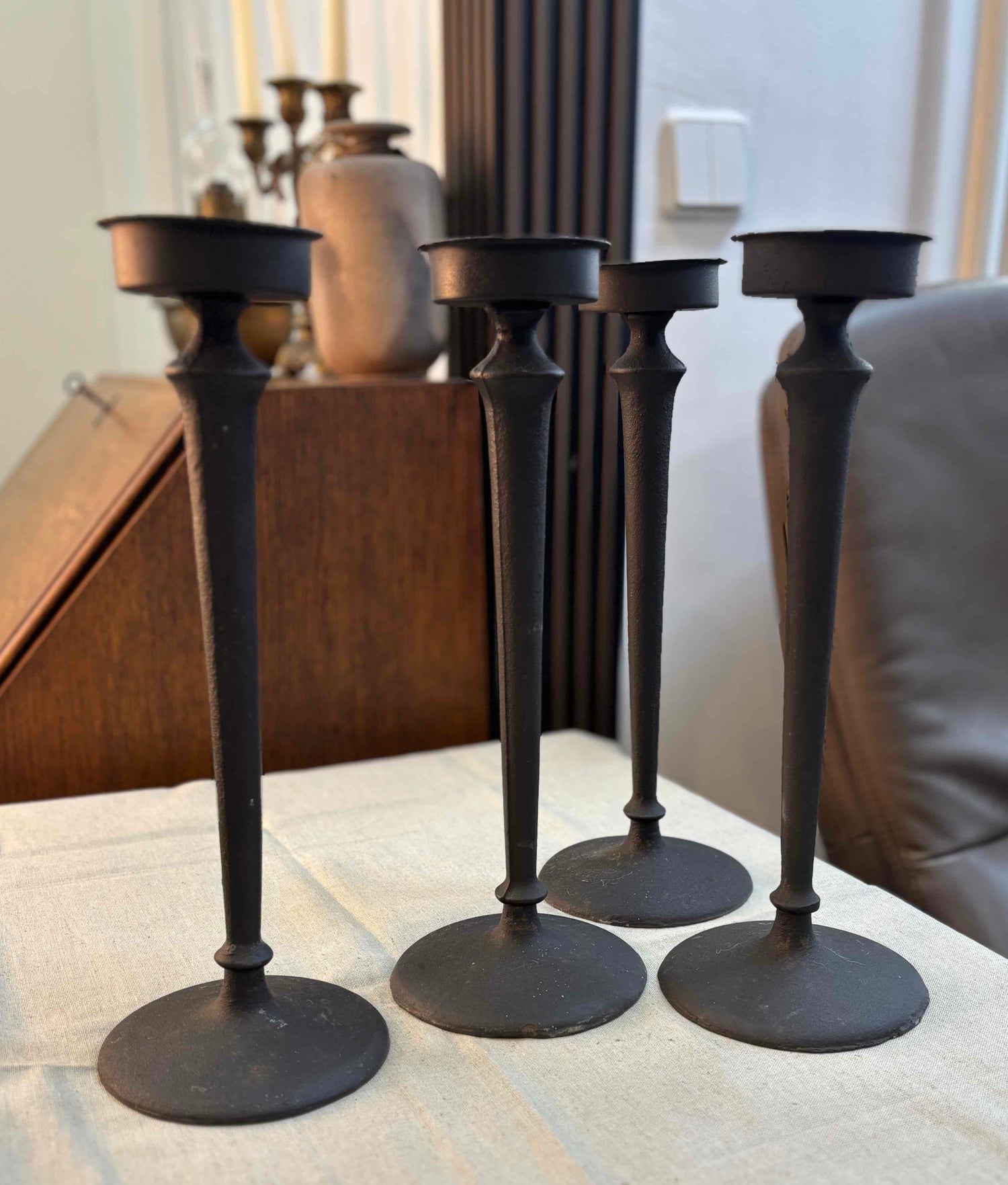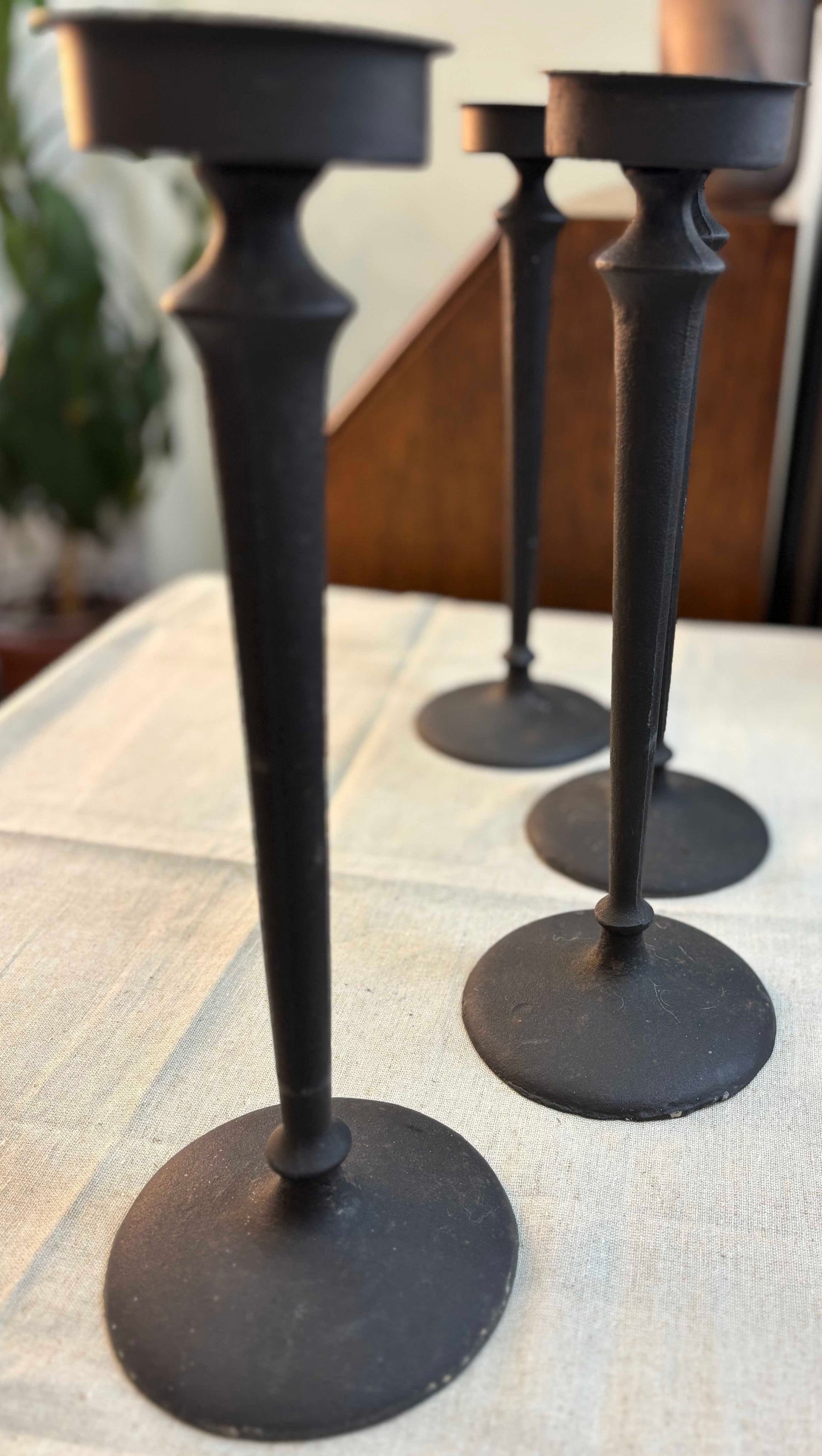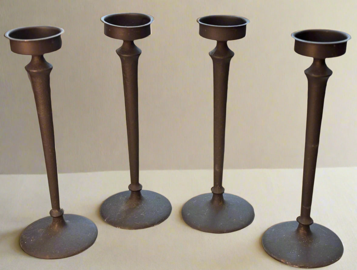 Тези опростени, но изискани, железни свещници в черно, осигуряват елегантен стил с уникалния си дизайн, като същевременно осигуряват вечна красота и рустикална елегантност. Отличаващ се с великолепно черно покритие, този комплект от четири свещника ще направи присъствието си известно, където и да бъдат изложени.