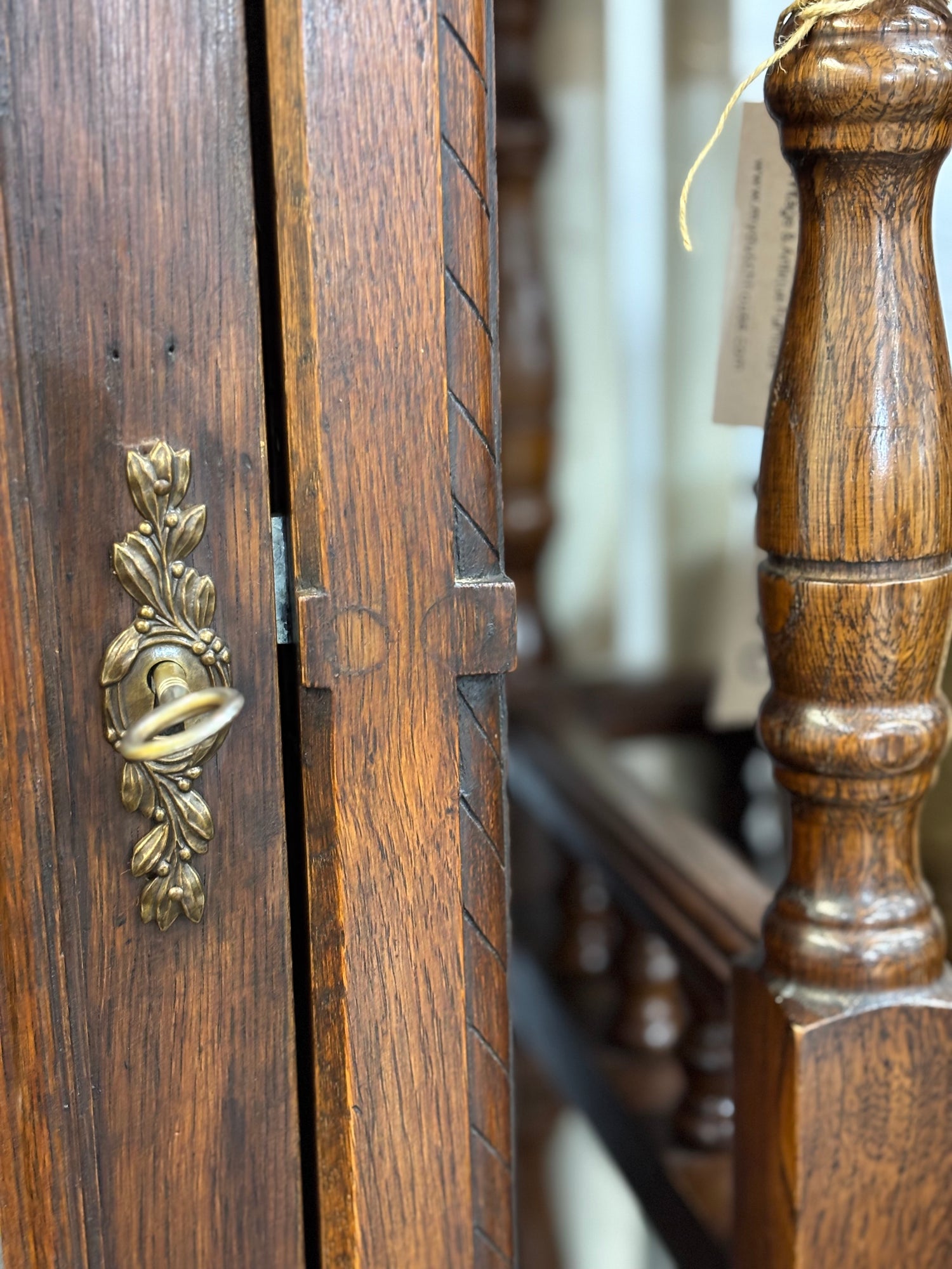 Класическа дъбова витрина (от първата половина на 20-ти век), изпълнена в традиционен европейски стил с арково чело и остъкляване, типично за старинните английски или континентално-европейски шкафове.